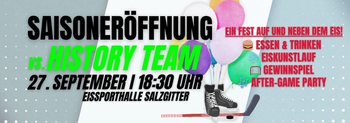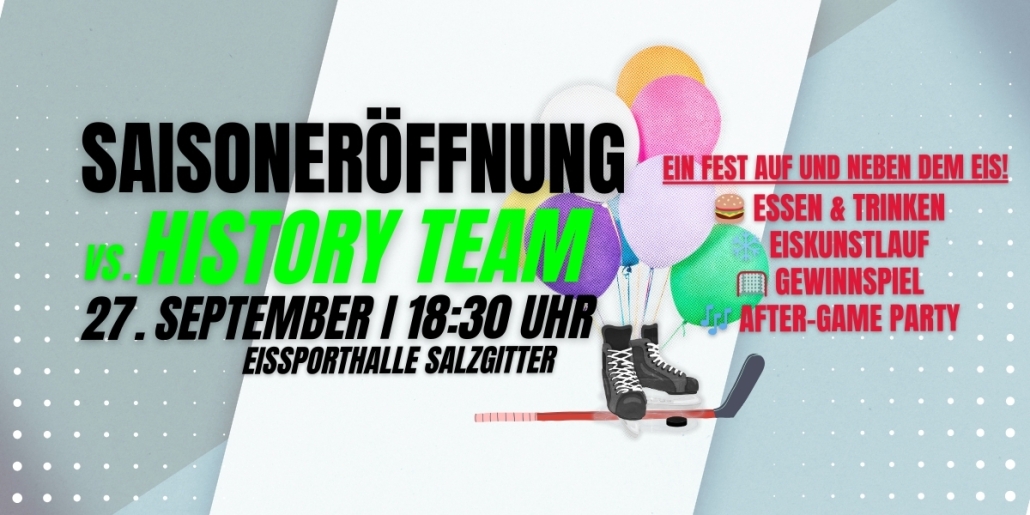 Nach dem Spiel geht die Feier direkt auf dem Eis weiter. Ein Drittel der Fläche ist mit Teppich und Stehtischen ausgestattet, zwei Drittel sind frei zum Schlittschuhlaufen. Bringt also gern eure Schlittschuhe mit oder leiht euch welche direkt in der Eishalle aus. Rund eine Stunde nach Spielende versteigern wir die Trikots des History Teams. Die Feier geht bis Mitternacht und wird das erste große Highlight der Saison.