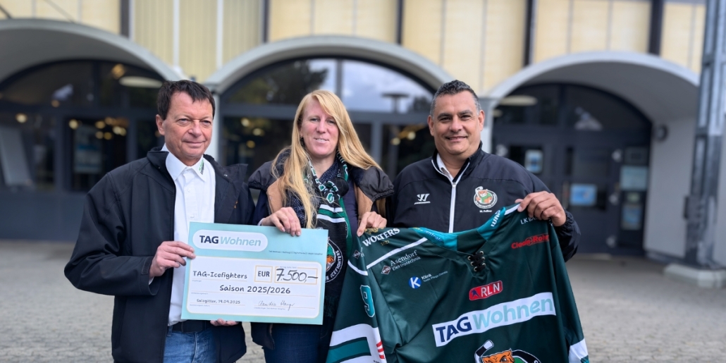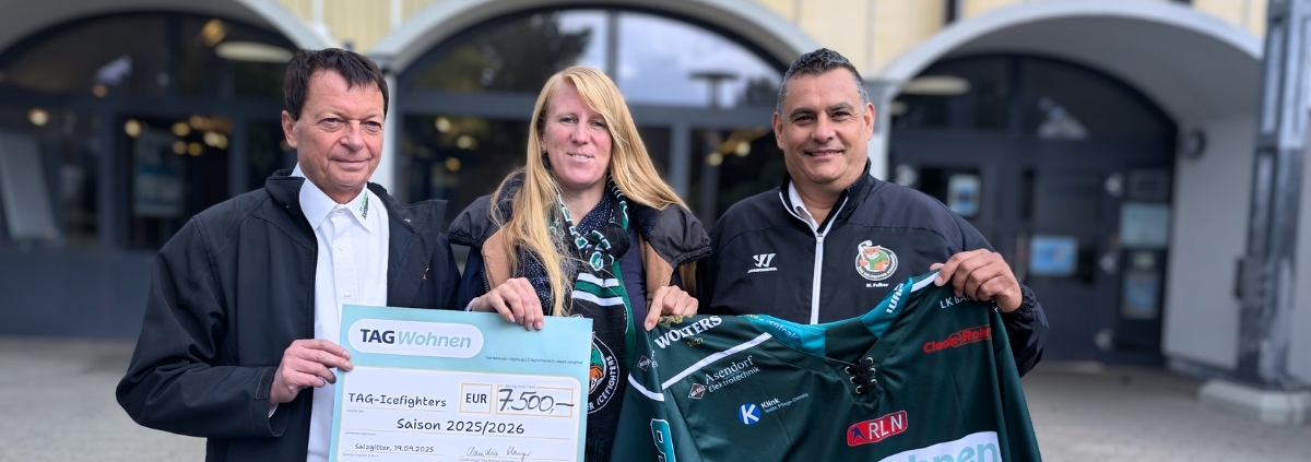 Diese lange Zusammenarbeit macht uns stolz und zeigt, wie stark der Eishockeysport in Salzgitter verwurzelt ist. Bei der symbolischen Scheckübergabe vor unserer Eissporthalle am Salzgittersee war die Freude groß. Gemeinsam mit Debora Aselmeyer von TAG Wohnen Salzgitter sowie unseren Vorständen Dirk Asendorf und Michael Felber konnten wir den Moment feiern. Als Zeichen unserer Dankbarkeit für die langjährige Verbundenheit überreichten wir TAG Wohnen Salzgitter unser neues Heimtrikot.